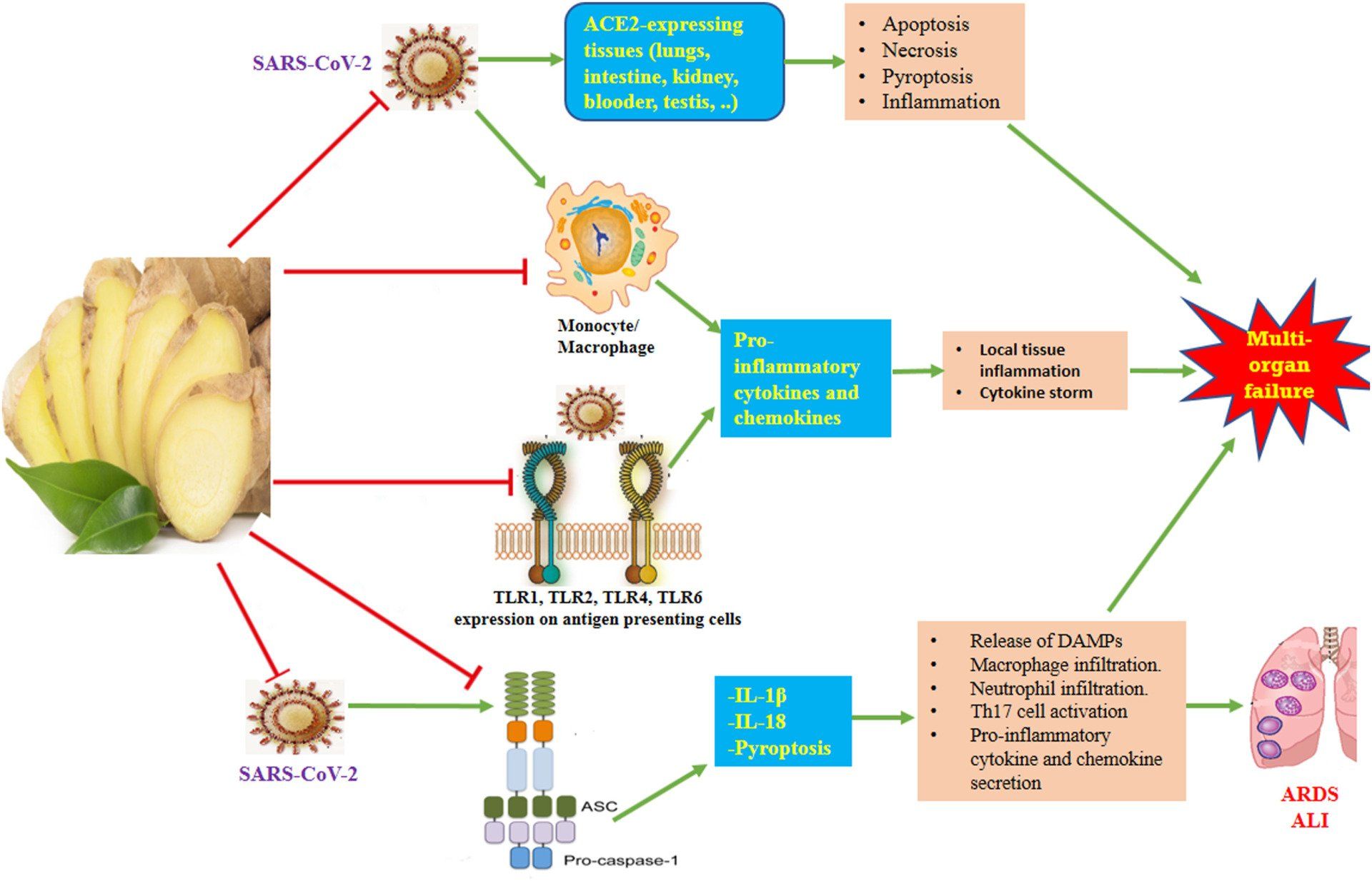 Currently, no specific therapy such as relevant anti-viral drugs is available for COVID-19. Herbs can provide valuable sources of components that have immunomodulatory, anti-inflammatory, anti-oxidative and antiviral properties, exerting beneficial effects on the systems that are affected by the virus.12 Experimentally and clinically, ginger (the rhizome of Zingiber officinale) has exhibited numerous therapeutic activities, including anti-inflammatory, antioxidative, immunomodulatory, antimicrobial, anti-fungal, anticancer, neuroprotective, antimigraine, hepatoprotective, hypo-cholesterolemic, cardiovascular protective, respiratory protective, anti-obesity, antidiabetic, anti-nausea, and anti-emetic effects.13 Ginger also displays direct anti-viral effects,14‒19 and can have a protective role against ARDS,20,21 which is the major cause of mortality in patients with severe COVID-19. Thus, ginger can have beneficial impacts on many organs that are affected by SARS-CoV-2 infection. This review provides evidence concerning the potential effects of ginger against SARS-CoV-2 infection and underlines its antiviral, anti-inflammatory, antioxidative and immunomodulatory impacts in an effort to consider this plant as an alternative therapeutic agent for COVID-19 treatment.